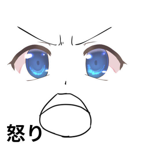 目尻を上げ、口角を下げます。口は堅く結んだ状態で下唇が少し上に上がった状態になります。
